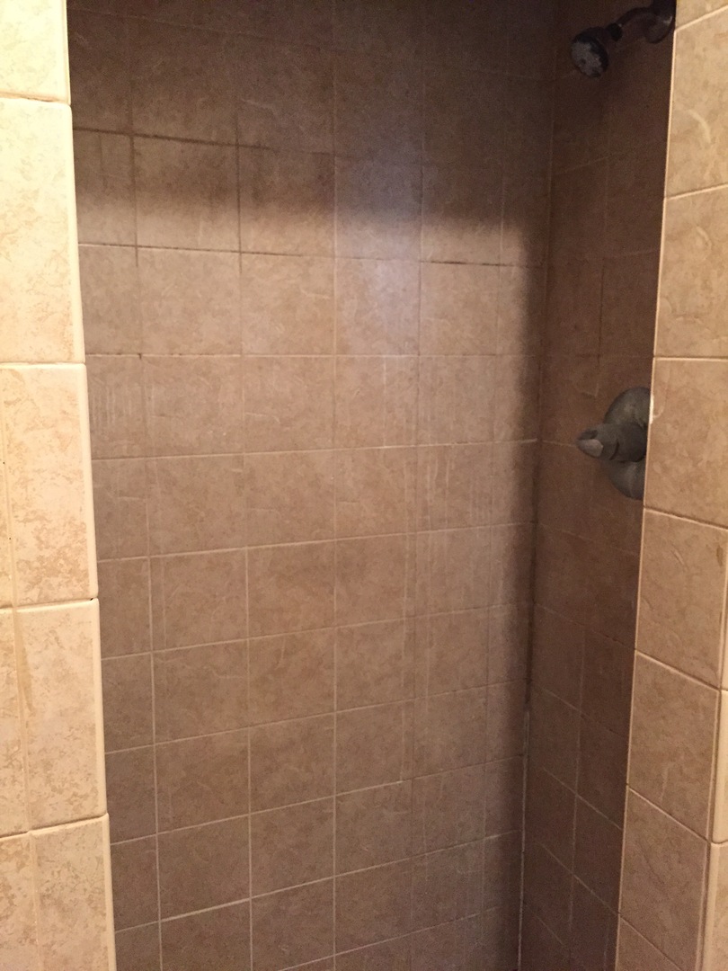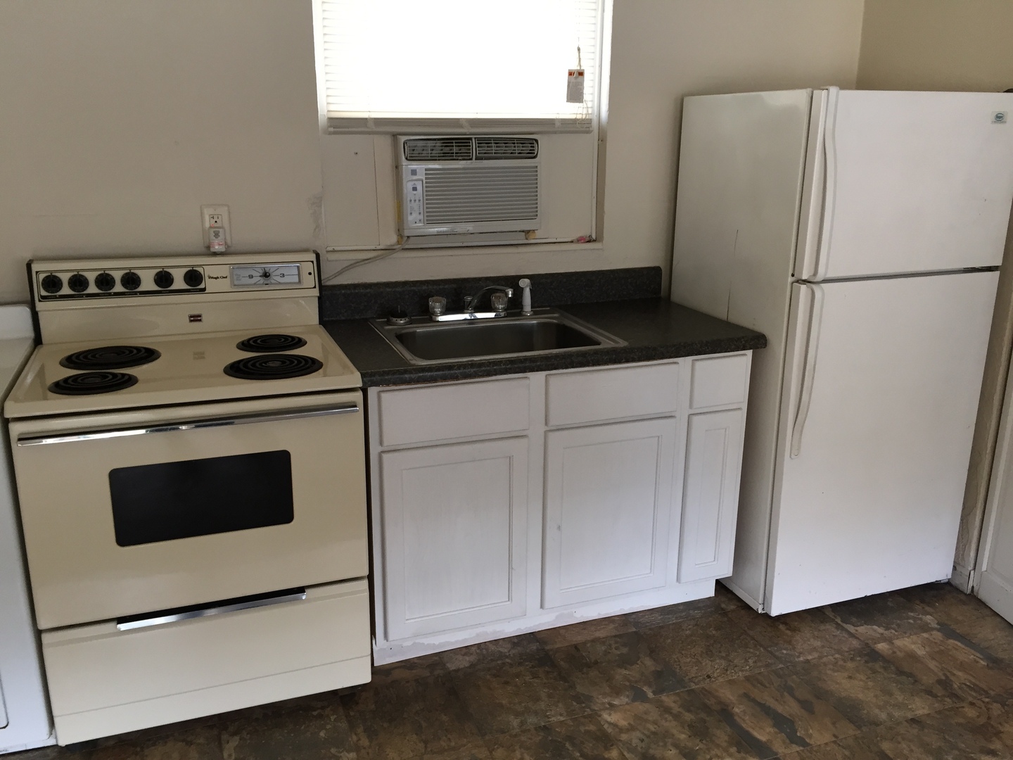It is carpeted, has a kitchenette, a closet, and a bathroom. There is a fridge, a small range, digital ac unit & a ceiling fan. In the bathroom there is a stand up tiled shower, a toilet, and vanity.